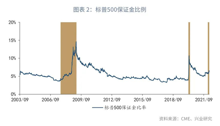 当风险传染至整个市场后,市场的波动明显放大,金融中介会为了降低自身的VaR(在险价值,是机构进行风险管理的重要工具)而选择提高资产的保证金比率,此时投资者的融资问题会更为严重,进而造成资金和市场的双流动性螺旋。比如,1987年股灾、1997年亚洲金融危机、2003年伊拉克战争、2008年次贷危机以及2020年3月疫情冲击,标普500期货的保证金要求都有大幅提升。相比上述几次,近期标普500期货保证金要求提升并不明显。总之,保证金比率取决于市场状况,并且在金融中介难以区分是流动性冲击还是基本面冲击导致市场巨幅波动时,保证金比率提升的可能性更大。