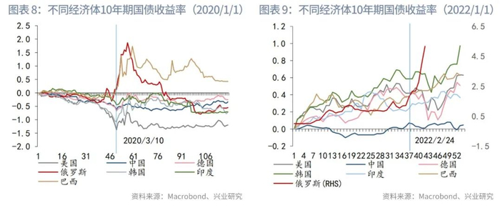 不可否认,大宗商品Margin Call在全球股债近期的巨震中,或多或少应该是起到了一定的作用。但是如果我们对比不同区域经济体股票指数以及债券收益率的走势,会发现这并不是2020年3月10日后的无差别抛售,而是分不同区域走势有明显分化。2022年初以来整体仍录得正收益的巴西和阿根廷股市在此前的抛售中跌幅并不明显,股市的抛售主要集中在俄罗斯和中国地区——俄乌风险导致全球投资者担忧制裁会波及中国。