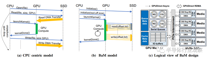 图4.传统的以 CPU 为中心的计算模型与 BaM 计算模型的比较如(a)和(b)所示。BaM 使 GPU 线程能够直接访问存储,从而实现细粒度的计算和 I/O 重叠。BaM 的关键组件的逻辑视图如 (c) 所示。