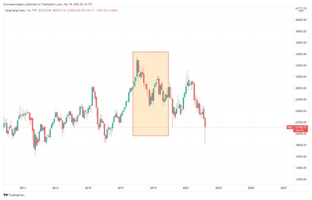 同时大家可见下图3个月Hibor的走势图表,对上一次2017年至2019年恒指下跌的时间,Hibor也同时上升,这表示资金成本上升,不利资产融资及抄卖。
