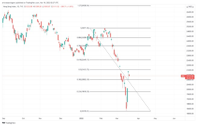 至于短线图,大家可以以黄金比率分析恒指未来反弹的阻力。如果0.5是21633点,那么0.618是22445点。同时留意一下春分(3月20日)或4月5日(清明)之后走势。