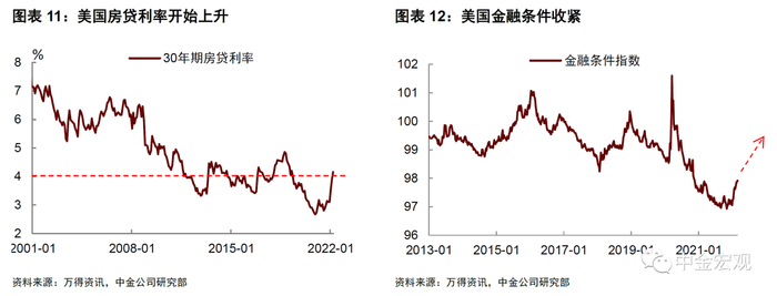 中期来看,我们认为更激进的货币紧缩将使融资成本上升,金融条件收紧,需求扩张受到抑制(图表11、图表12)。如果经济下行的速度快于通胀放缓,那么还将形成“滞胀”格局。综上,油价大涨对美国并非好事,即使不会很快带来衰退,也会增加经济“滞胀”风险。对于美联储而言,“滞胀”是他们最不愿意面对的宏观环境。