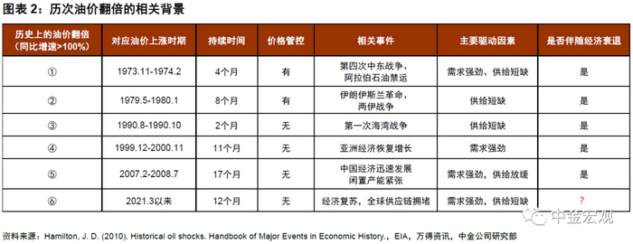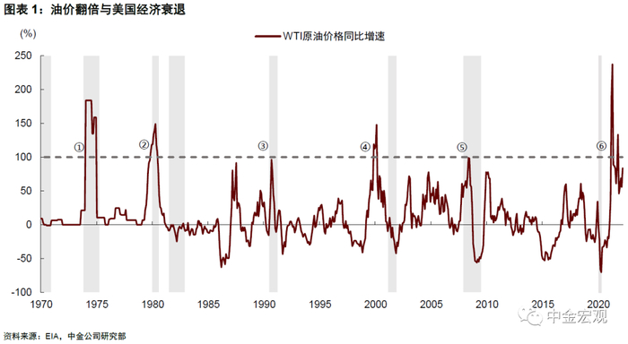 1970-2020年,原油价格共出现过5次翻倍阶段,分别发生在:1973-1974年,1979-1980年,1990年,1999-2000年,以及2007-2008年。尽管每次油价大涨的原因各有不同,但无一例外的是,油价翻倍后都美国经济都出现了衰退(图表1、图表2)。换句话说,从统计规律看,油价翻倍与经济衰退高度相关。