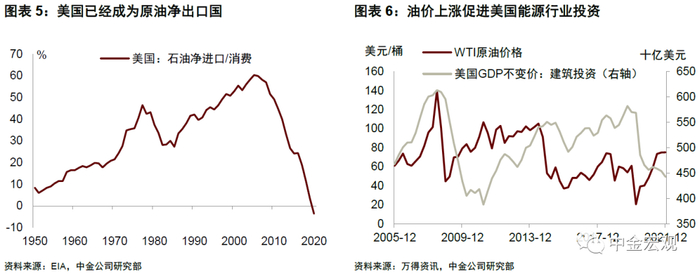 有利方面在于促进能源行业投资,这与以前不一样。过去几十年,美国一直是原油净进口国,对海外原油的依赖度较大,每当油价大涨时,美国的贸易条件就会因进口昂贵的原油而恶化。近几年来,随着页岩油行业迅速发展,美国已经转变为了原油净出口国(图表5)。油价上涨不仅不会再让贸易条件恶化,反而会促进美国能源行业投资,拉动经济增长(图表6)。总体看,油价上涨对美国总需求的直接负面影响或没有以前那么大了。