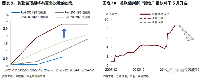 当前美国劳动力市场强劲,通胀远高于目标,美联储货币紧缩已是板上钉钉。在此基础上,如果油价持续上涨,美国通胀还将更高,美联储也将加快货币紧缩节奏。根据我们在报告《油价上涨如何影响美国通胀?》中的测算,极端情形下,西方国家对俄罗斯的制裁不断升级,布伦特油价Q1-Q4均值分别为110、120、130、130美元/桶,那么美国CPI通胀全年都可能在7%以上(图表7、图表8)。这种情况下,美联储需要增加加息次数,同时在“缩表”方面表现的更加积极。根据美联储3月议息会议的指引,今年预期的加息次数已从去年底的3次上调至7次,“缩表”最快将于5月开启(图表9、图表10)。