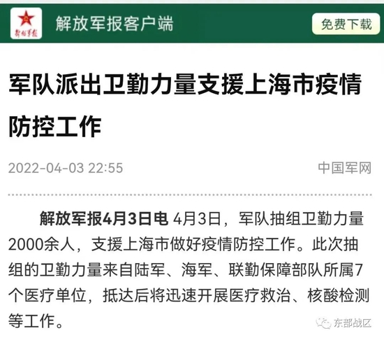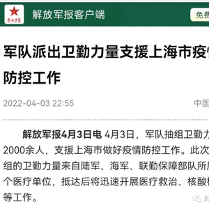 据解放军报,4月3日,军队抽组卫勤力量2000余人,支援上海市做好疫情防控工作。此次抽组的卫勤力量来自陆军、海军、联勤保障部队所属7个医疗单位,抵达后将迅速开展医疗救治、核酸检测等工作。