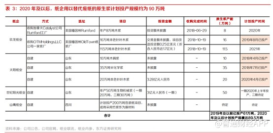 这两种方式因涉及自建或收购后改建,建设周期至少 1-2 年,根据当前各大纸企已公布的项目规划,2018-2019 年已成功投产的用以替代废纸的原生浆产量共 61 万吨,2020 年及以后计划投产规模约为 90 万吨,供给整体有限。