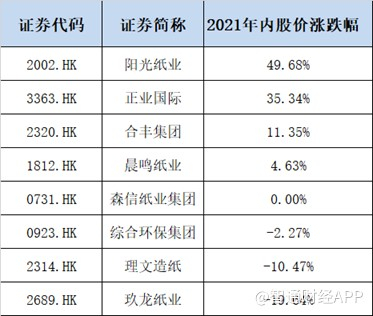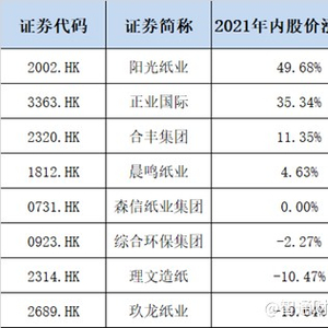 智通财经了解到,从港股诸多造纸企业的股价走势来看,2021年阳光纸业(02002)以累计49.68%的涨幅位居榜首。