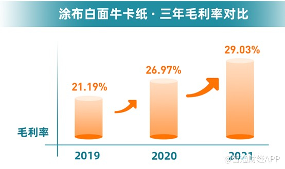 不仅如此,涂布白面牛卡纸亦是公司主要的盈利点。数据显示,阳光纸业的涂布白面牛卡纸近三年来毛利率持续提升,2021年已达到29.03%,较2020年提升2.06个百分点。