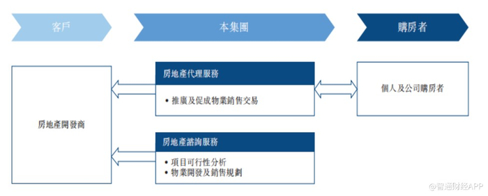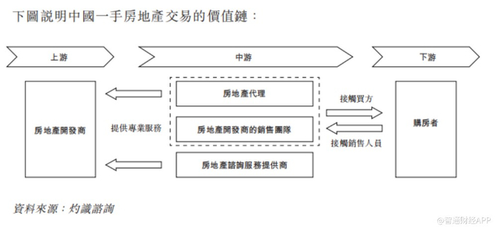 据智通财经了解,一手房地产市场价值链的上游市场参与者为发起及管理房地产开发项目的房地产开发商。房地产开发商委聘中游市场参与者(包括房地产代理)向价值链下游的购房者宣传及销售一手房地产物业。就更成熟的房地产开发商而言,销售物业可由内部销售团队进行。于发展项目的各个阶段,房地产开发商委聘中游的房地产咨询服务提供商以寻求专家意见。