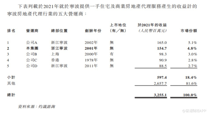 根据灼识咨询报告,按2021年一手住宅及商业房地产代理服务产生的收益计,公司于宁波及苏州的所有房地产代理中排名第二及第五,分别占市场份额的4.8%及0.4%。