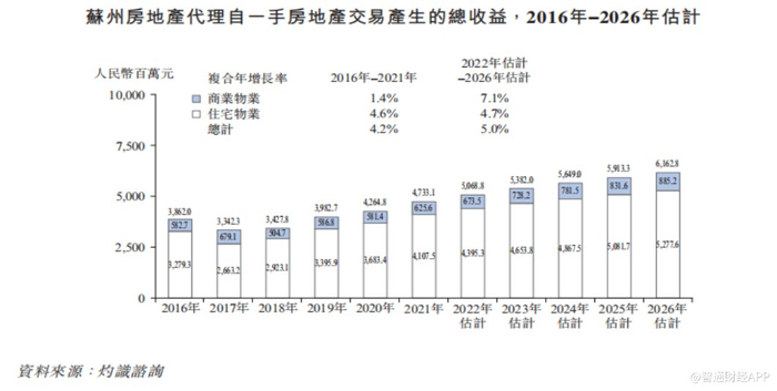 苏州房地产代理自一手房地产交易产生的总收益由2016年的人民币38.62亿元增加至2021年的人民币47.33元,复合年增长率为4.2%。该价值估计将进一步增加并于2026年达到1.63亿元,2022年至2026年间的复合年增长率为5%。