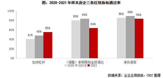 具体到样本房企三项核心指标²的通过率来看,2021年末净负债率的通过率从年初的86%略微下滑至84%,通过率仍然最高,非受限现金短债比的通过率下滑最明显,年末通过率64%,较年初明显下滑16pct,资金紧张、短债偿债压力增加成为房企众生相。而扣预收后资产负债率的改善难度仍是最大,年末通过率55%,较年初改善明显,房企降杠杆诉求较为迫切,整体资本结构趋于优化。