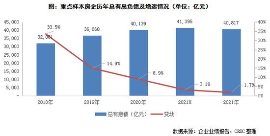 2021年末重点样本房企的总有息债规模为40817亿元,有息债规模持续维持较高水平,同比增长1.7%,增速较2020年的8.9%继续下滑7.2pct。一方面,自2020年8月监管提出“三条红线”要求之后,房企的有息负债水平增长有所限制,2021年上半年较期初增长3.1%至41395亿元,增幅较2020年约8.9%的增幅继续收窄;另一方面,2021年下半年行业调控加码,企业的预售资金监管幅度加大,现金流动性受到较大的影响,导致行业暴雷情况频发,仅有国企央企和部分较为优质的民营企业发债受到支持,较多企业的再融资情况不乐观,从而导致部分企业的债务规模下降较大,2021年下半年企业有息债净流出578亿元,从而使得全年与期初持平。
