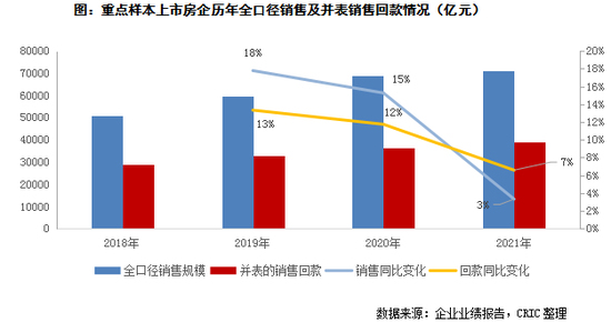 2021年上半年,房企融资“三道红线”、房贷管理“两道红线”持续发力,银行业金融机构急于“收伞”,在一定程度上导致下半年房企暴雷事件频发。基于个别大型房企风险暴露,金融机构对房地产行业的风险偏好明显下降,房企境内融资出现了一致性的收缩行为。与此同时,国际评级机构批量下调中国房企信用评级,房企海外融资近乎陷入停摆。受此影响,企业资金周转压力不断加剧,“促销售、抢回款”成为业内共识。