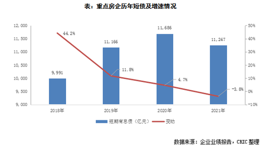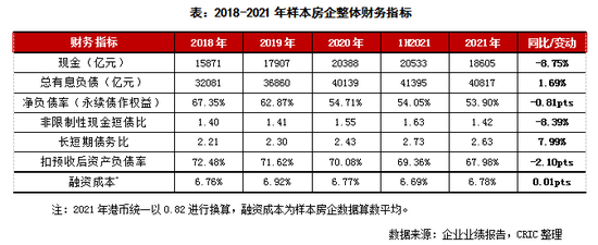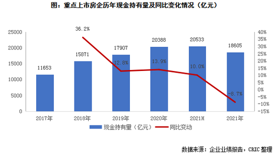 2021年末重点上市房企的现金持有量为18605亿元,同比下降了8.75%,这是近五年来首次出现下降。从历年来看,现金持有量增速逐年下滑,由2018年的36%的增速逐步下降到2019、2020年的10%以上的增速。