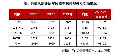 分梯队来看,各个梯队企业的长短债表现分化。TOP10房企积极改善债务结构,推动长债置换短债,强者恒强,短期有息债同比下降了11.8%至2972亿元,降幅较2021年中期的3.3%进一步收窄,债务安全边界进一步增强。而TOP51+的房企,2021年中期短期到期债务较期初下降1.8%,但由于2021年下半年该梯队企业再融资影响较大,短期到期债务2021年末较其中净增加207亿元,使得2021年末该梯队短期到期债务同比增长6.3%至2689亿元。