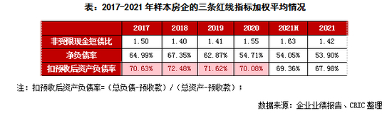 自2020年8月底监管颁布“345”融资新规以来,三条红线指标成为房企未来有息负债规模增速的重要衡量标准,进入绿档成为多数未达标房企的中短期目标。2021年末样本房企加权平均的三条红线核心指标实现全面达标,除非受限现金短债比外其余指标均较年初和年中逐步改善。