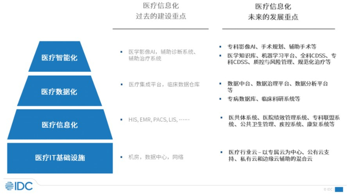 医疗信息化技术的升级表现在四个层面,即医疗IT基础设施、医疗信息化、医疗数据化和医疗智能化,这四个方面正在带动医疗数据价值挖掘和医疗软件践行价值。IDC认为有如下发展趋势和重点: