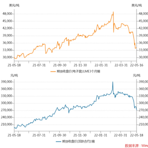 自2021年5月以来,LME3个月锡期货收盘价由30000美元/吨震荡上涨至俄乌冲突之前的45100美元/吨(2月23日),9个月整体涨幅为50.3%。俄乌冲突爆发后,锡价在2周内迅速上涨至49000美元/吨高点(3月8日),涨幅约8.6%。此后,锡价震荡下行,至5月 17日跌至34150美元/吨,70天内跌幅达30.3%。沪锡期货价格也出现了类似的波动。