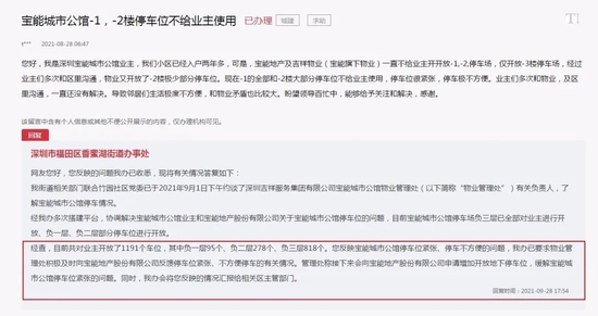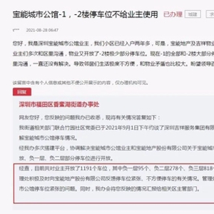 宝能公馆的车位纠纷由来已久。据人民网领导留言板,2021年8月,有业主反映,小区负一楼全部和负二楼大部分停车位不给业主使用,停车位很紧张,停车极不方便。之后,福田区香蜜湖街道办事处回复称,该办已要求物业管理处积极及时向开发商反馈停车位紧张、不方便停车的有关情况。物业管理处称,接下来会向开发商申请增加开放地下停车位,缓解小区停车位紧张问题。