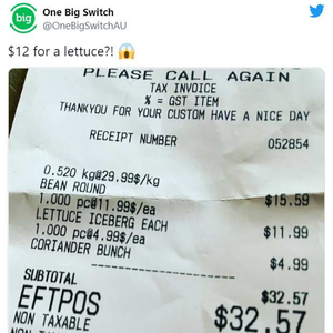 事实上,除了生菜外,该地区的其他蔬菜和水果的价格也在飞涨。消费者们对此纷纷在社交媒体上发泄情绪,表示要花12澳元(约合8.61美元)才能买一棵卷心莴苣,其他农产品的价格则更高,一个西瓜的价格高达25澳元。