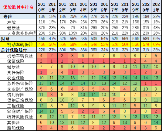 保险的赔付率总体保持一个相对较平稳的状态,其中的寿险的赔付率总体是相对于较低的。财险的赔付率相对较高。寿险赔付率最高的在2015年达到27%的水平,现在寿险的赔付率或者给复率仅有19%的水平,所以寿险经营者还是一个比较愉快的好的状态,封闭性也是很强的。而财险的总体的赔付率在55%左右的水平,今年上升到56%的水平。其中机动车的车辆保险的赔付率,目前处于保险赔付率中相对比较低的水平,排名排在第八位的水平。
