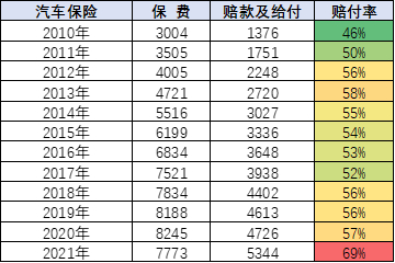 汽车保险的保费和赔付率。总体来看,前几年处于在55%左右的一个水平上,其中在2010年之前是低于50%水平的;2012年和2013年达到了56%和58%的较高的保险赔付率的水平。随后通过整顿和交强险的拉动,又逐步的从58%的百分比降到了2017年的52%的一个较低的水平。但2018年和2019年,随着车市的增长相对放缓,赔付的压力相对较大,赔付率又上升到56%的水平,2020年也仅有57%。总体来看,还是因为我们保费的增长速度相对放缓的压力较大。但2021年的保费收入下降较明显,但赔付大幅增长,这也是超预期的保险收入支出变化,压力巨大。