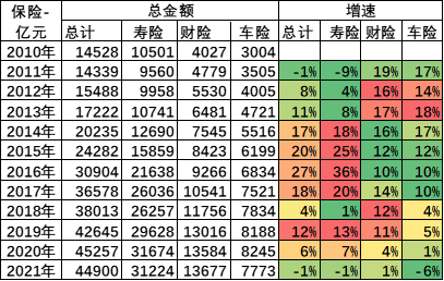 中国保险市场在2011年出现小幅调整之后,逐步进入较快的增长期,尤其在2014年开始到2017年,整体保险处于两位数的10%-20%之间的高增长期;2018年的保险出现相对的调整,尤其是寿险出现了一定的增长;而2019年总体保险又出现了高增长特征;2020年保险总体运行抵御疫情较好;2021年偏差。其中寿险的表现是相对突出的,财险等表现总体来看处于一个相对平稳的一个增长期。其中,汽车保险应该说从2010年-2017年以来一直保持10%以上的高增长,但2018年之后,汽车保险的保费的增长处于5%左右的一个低速的增长状态,与财险的总体增速相对来说处于较低的一个水平。2020年车险增速仅有1%,2021年下降到-6%。