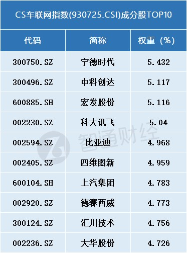 CS车联网指数(930725.CSI)则仅有车联网ETF(159872.SZ)1只ETF跟踪。资料显示,该指数将内容与服务提供商、软件提供商、硬件提供商、汽车厂商等相关上市公司纳入车联网主题,以反映车联网上市公司的整体表现,权重占比前十大只个股中,中科创达、四维图新、德赛西威等依旧在列,此外,宁德时代、比亚迪、上汽集团(600104.SH)也位列其中。