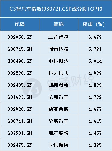 具体来看,CS智汽车指数(930721.CSI)有4只ETF跟踪,分别为智能汽车ETF(515250.SH)、智能驾驶ETF(516520.SH)、智能车ETF基金(159795.SZ)、智能车ETF(159888.SZ)。该指数反映的是智能汽车产业公司的整体表现,成分股共47只,权重排名前十的个股中,有4只与自动驾驶紧密相关,闻泰科技(600745.SH)、中科创达、四维图新、德赛西威(002920.SZ)权重占比分别为5.781%、5.014%、4.838%、4.677%。
