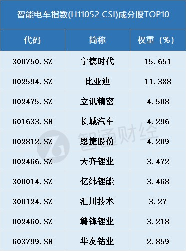 与CS智汽车指数不同的是,该指数成分股中不仅有智能汽车产业链个股,权重占比较大、数量较多的还是新能源板块相关个股,权重排名前14的个股如宁德时代(300750.SZ)、比亚迪(002594.SZ)、恩捷股份(002812.SZ)等大多与新能源板块相关,智能汽车个股权重占比不高。