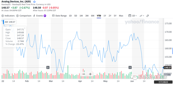 ADI方面,与4月底12.36%的跌幅相比,7月7日股价为148.57美元,较年初下跌16.13%,在11家芯片企业中跌幅最小。