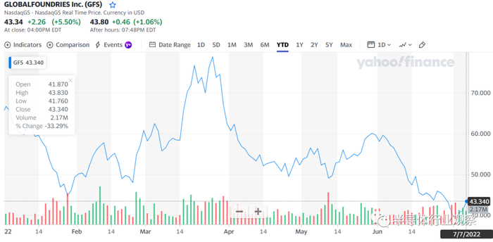 格芯在去年10月28日才正式上市,2022年迄今为止最高股价为78.94美元,而7月7日的股价则跌至43.34美元,甚至低于刚上市时的46.4美元。