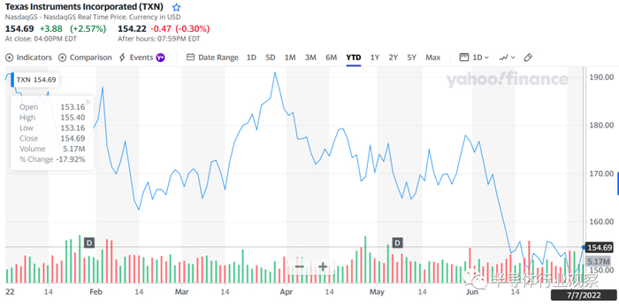 德州仪器作为模拟芯片领域的龙头,2022年迄今,在3月29日到达了191.01美元的高点,7月7日股价为154.69美元,相比年初下跌18.84%。