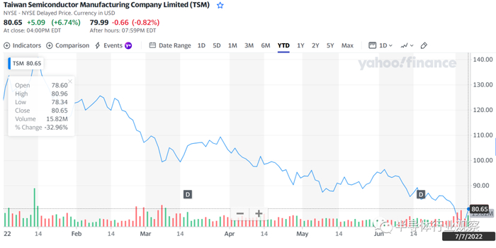 台积电在今年1月14日股价涨至140.66美元,市值达到7294.6亿美元,接连超越英伟达及伯克希尔,跃居全球第8大,不过到了7月7日,其股价已经跌至80.65美元。