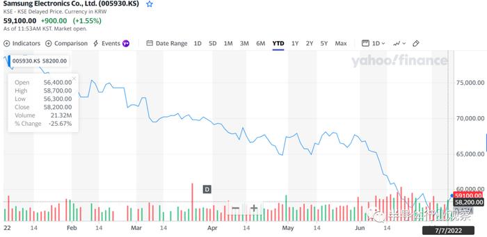 三星作为全球最大的存储芯片商,2022年迄今为止最高的股价为78900韩元,7月7日股价已跌至58200韩元。