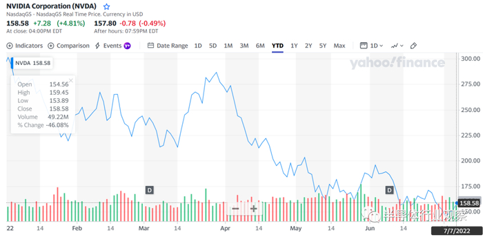 AMD在4月的时候,股价跌幅就已破40%,一个不怎么算好消息的消息是,到了7月,英伟达的跌幅已经反超AMD,不过AMD本身也已经高达47.22%。