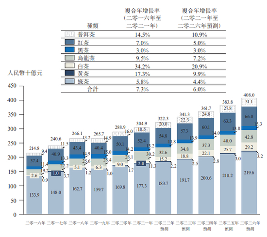 普洱茶的市场规模由2016年的94亿元增加至2021年的185亿元,年复合增长率为14.5%;预计到2026年年复合增长率约为10.9%。
