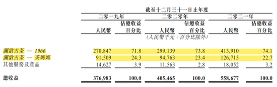 其中,主打普洱茶爱好者及资深茶友普洱茶叶产品的“1966”,2019年、2020年和2021年的收入贡献分别为2.71亿元、2.99亿元和4.14亿元,占比分别为71.8%、73.8%和74.1%。