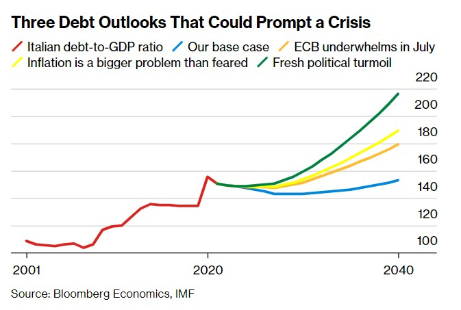 而如果欧洲央行需要在加息方面更加激进,意大利的借贷成本可能会变得更加难以维持。这也形成了彭博经济预期的第二个场景。彭博经济警告称,即使将利率提高到3%,也可能将意大利的债务推上“爆炸的道路”。