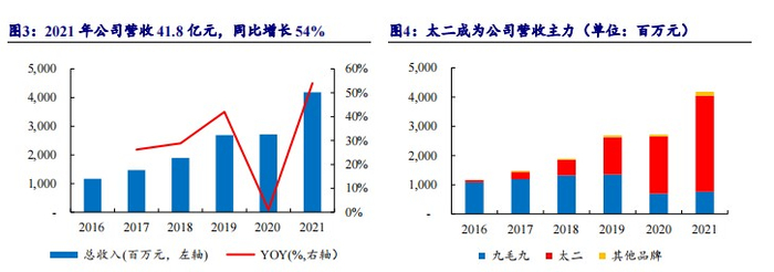 多品牌布局多场景,协同打开增长空间是九毛九的美好愿景。火锅、烤鱼、小吃等赛道上的试探,让九毛九的想象空间有所提升。然而,2021年门店数量除了太二大幅增长外,2颗鸡蛋煎饼(自营)门店仅增长3家,怂冷锅串串仍为1家。所以其他品牌如怂火锅、烤鱼等尚未给其业绩提供太多助力。2021年公司来自其他品牌的收入为1.27亿元,占总营收比例仅为3%。