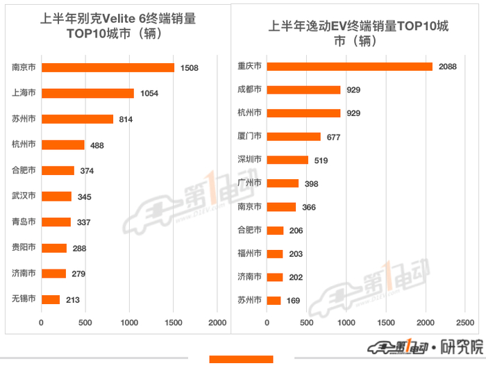别克Velite6上半年终端销量13,978辆,出租租赁市场8,653辆,占比61.9%。其在南京、上海最畅销,终端销量超千辆。逸动EV上半年终端销量8,499辆,出租租赁市场8,011辆,占比94.3%,其在重庆最受欢迎。
