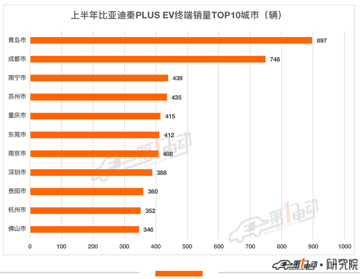 比亚迪秦PLUS EV终端销量45,861辆,出租租赁市场11,431辆,占比24.9%,这也说明秦PLUS EV的主战场是对私市场。其在青岛、成都、南宁三个城市最受欢迎,而且在各城市的终端销量均衡,都在百辆左右,均未达到上千辆。