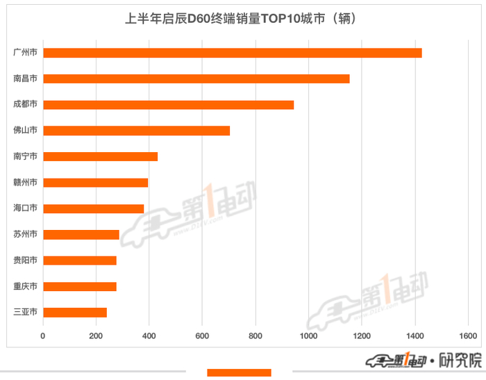 启辰D60出租租赁市场的终端销量为11,333辆,占其全部销量的82.3%。其在广州、南昌最畅销,终端销量均超千辆,其次是成都、佛山和南宁,终端销量均超500辆。
