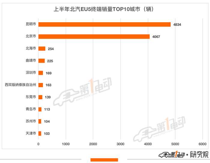 北汽新能源EU5终端销量13,387辆,出租租赁市场终端销量11,927辆,占比89.1%。其在昆明、北京最受欢迎,终端销量分别达4834辆、4067辆,且仅这两个城市终端销量达到千辆,其余城市均几百几十辆。