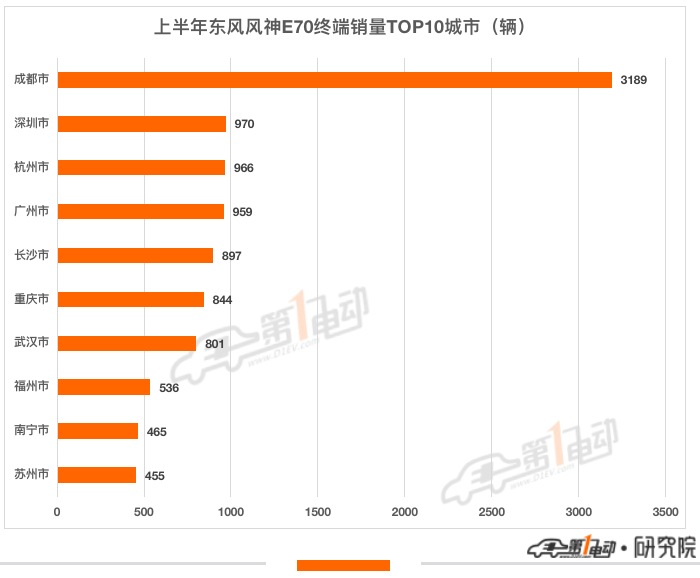 东风风神E70上半年终端销量18,426辆,出租租赁市场的终端销量16,912辆,占比高达91.8%。其在成都最畅销,上半年终端销量达3,189辆,而在深圳、杭州、广州、长沙、重庆的终端销量不到千辆。