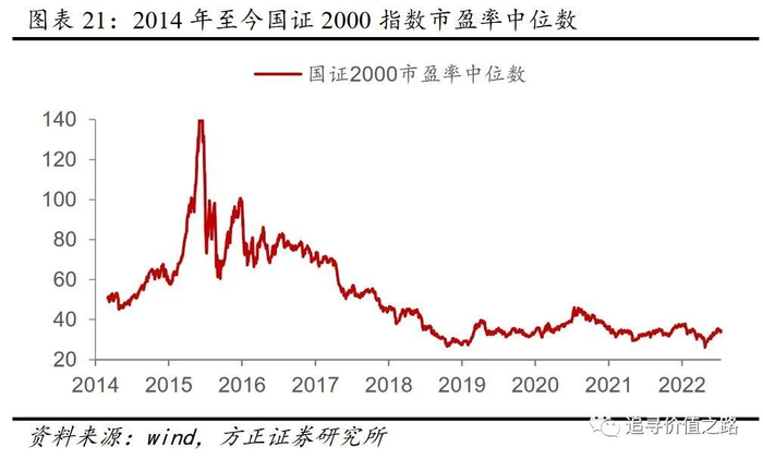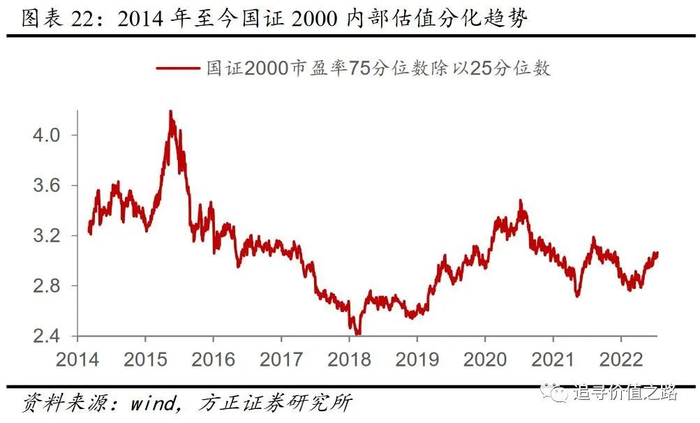 截至2022年7月16日,国证2000市盈率中位数为34.1倍,位于2014年至今25%的历史分位数水平;国证2000市盈率75分位数除以25分位数的比值为3.07倍,内部估值分化程度位于2014年至今53%的历史分位数水平。