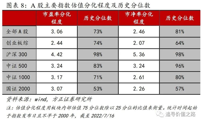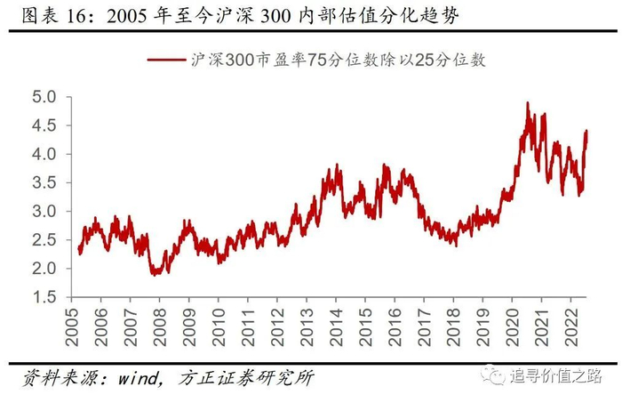 截至2022年7月16日,沪深300市盈率中位数为22.8倍,位于2005年至今43%的历史分位数水平;全部A股市盈率75分位数除以25分位数的比值为4.42倍,内部估值分化程度位于2005年至今98%的历史分位数水平,沪深300指数成分股估值分化程度进一步加深。