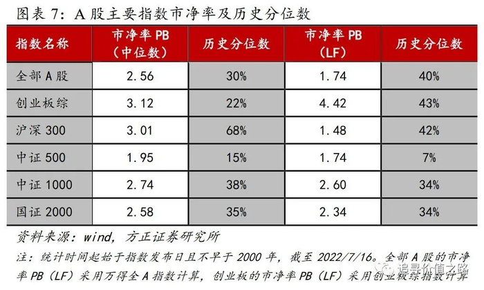 从上表的市盈率情况可以看到,本月A股主要指数的市盈率中位数全部低于历史中位数水平。尤其是中小市值公司估值较上月有明显提升,但仍处于较低水平,估值修复正在进行中。从下表的市净率情况可以发现相似的规律。